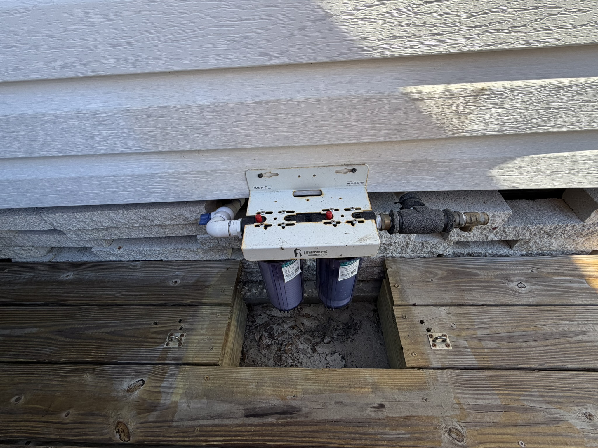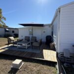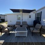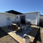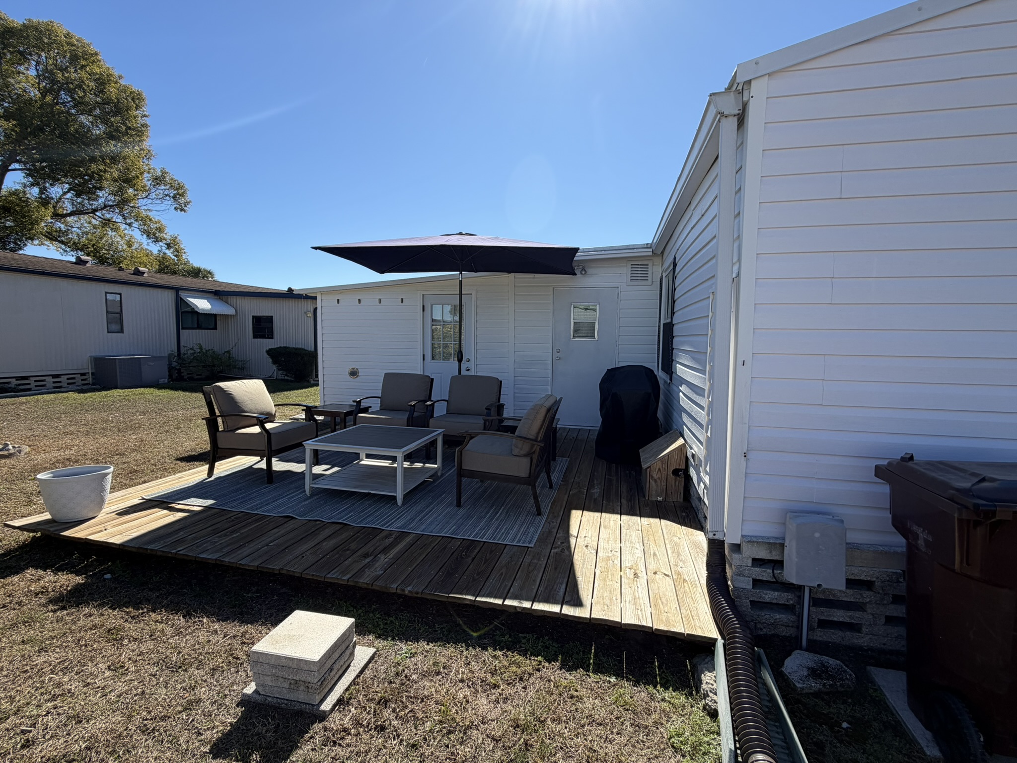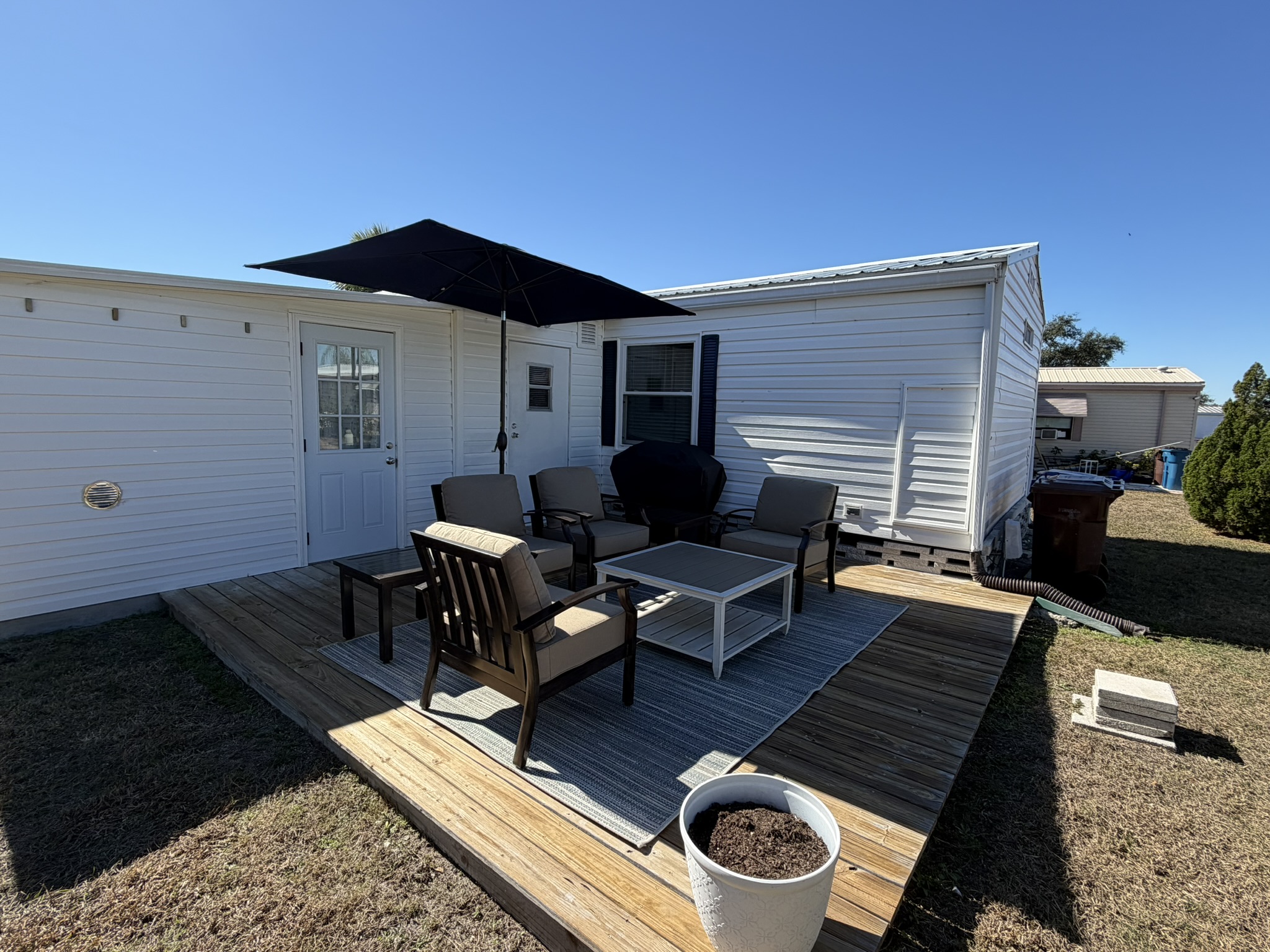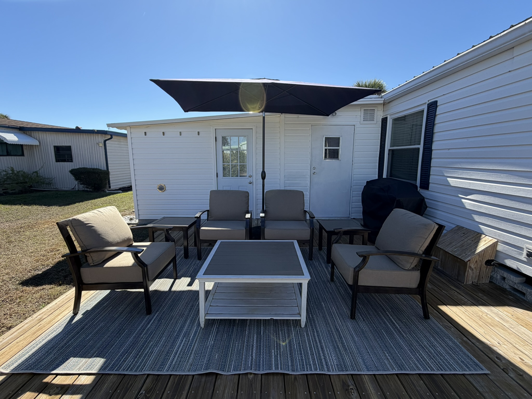 -new exterior deck (2023) and beautiful patio furniture with umbrella
