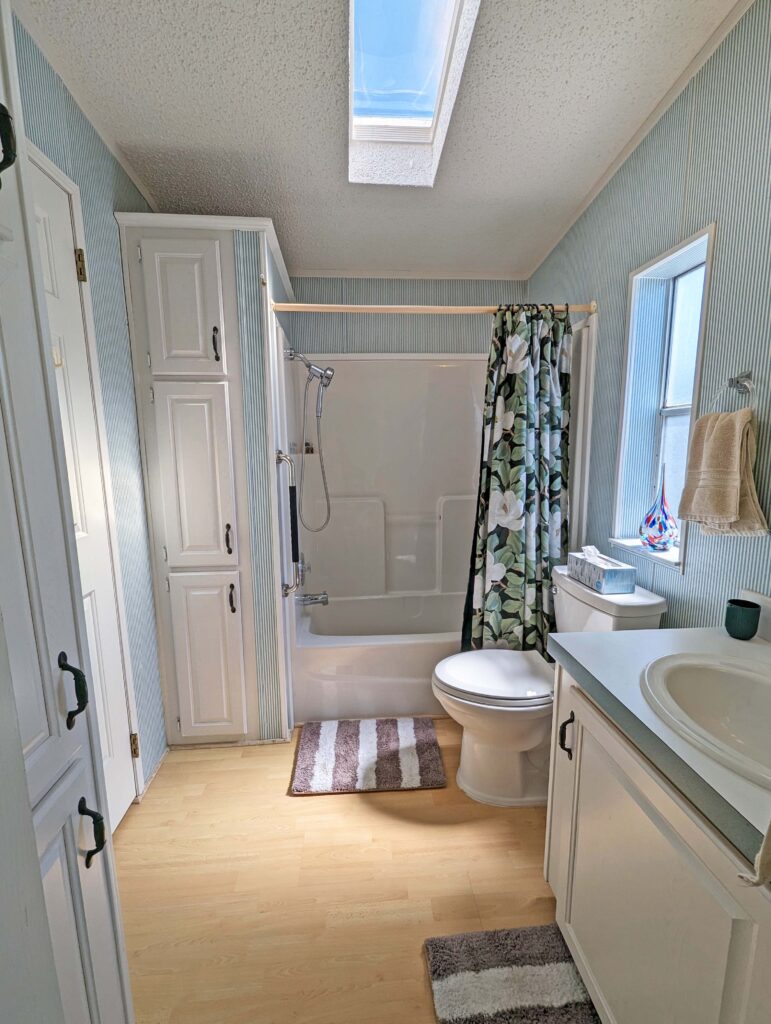The master suite is off the living room and features a generous walk-in closet and ensuite. With a skylight, double vanity, walk-in shower, and separate water closet, this bathroom has it all.