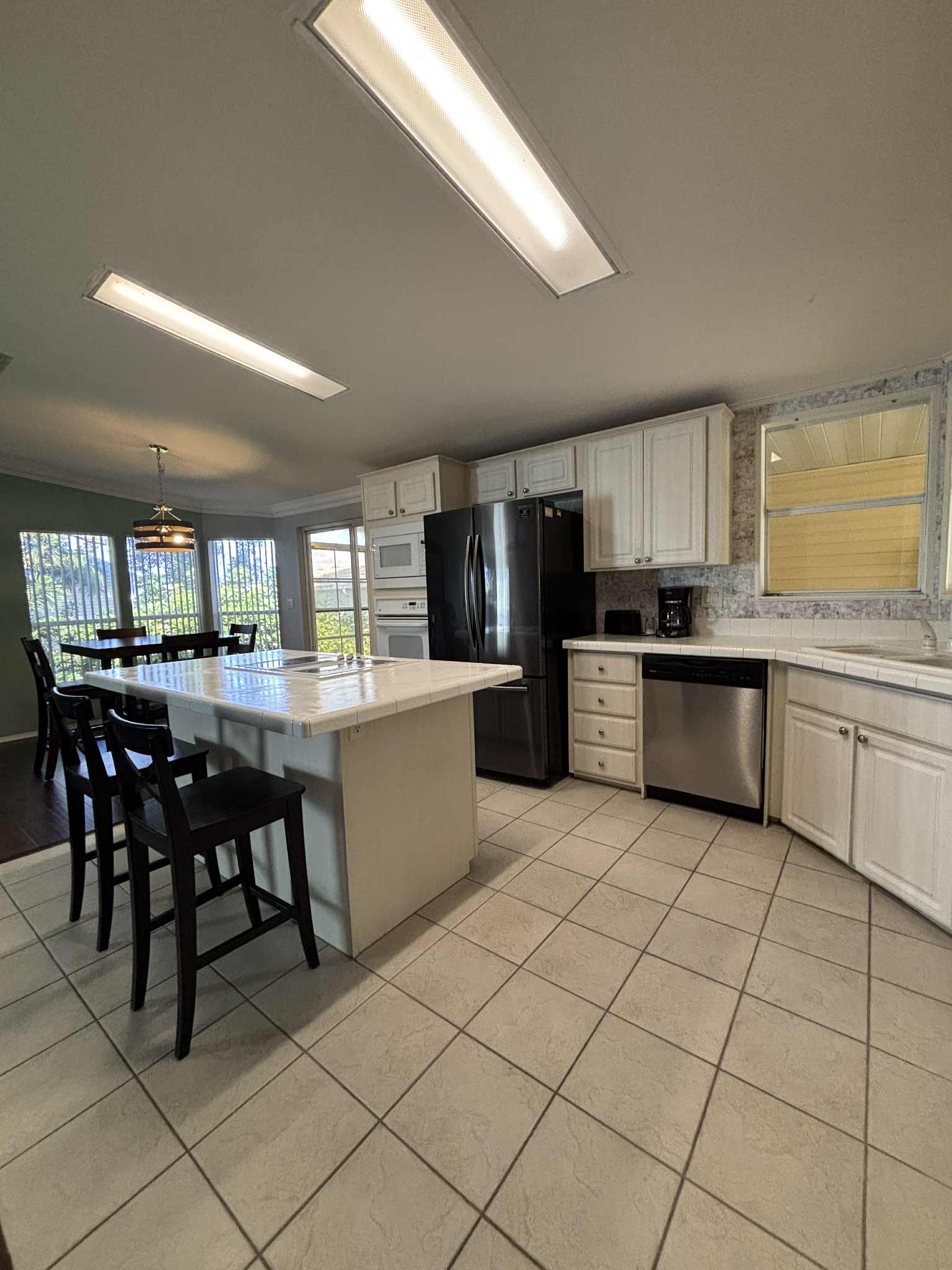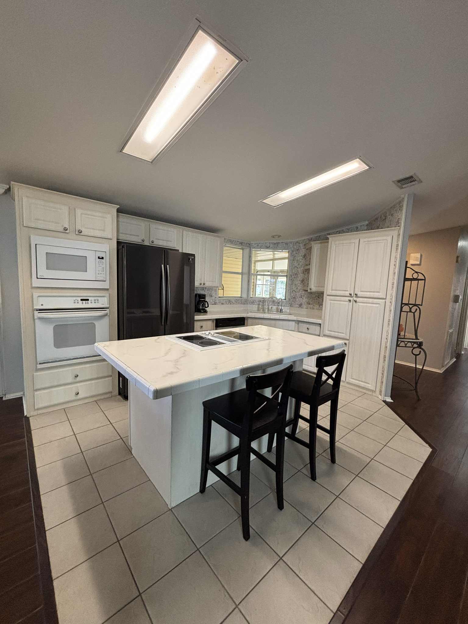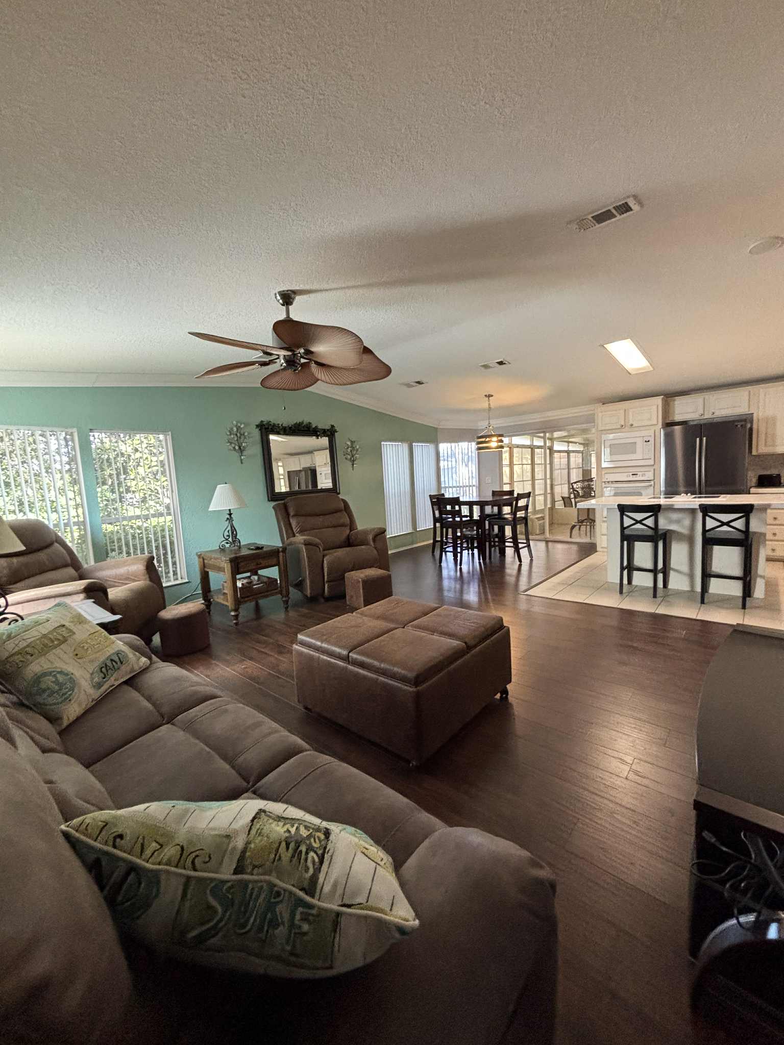 Open-concept layout with island kitchen and bar stools