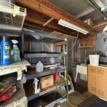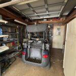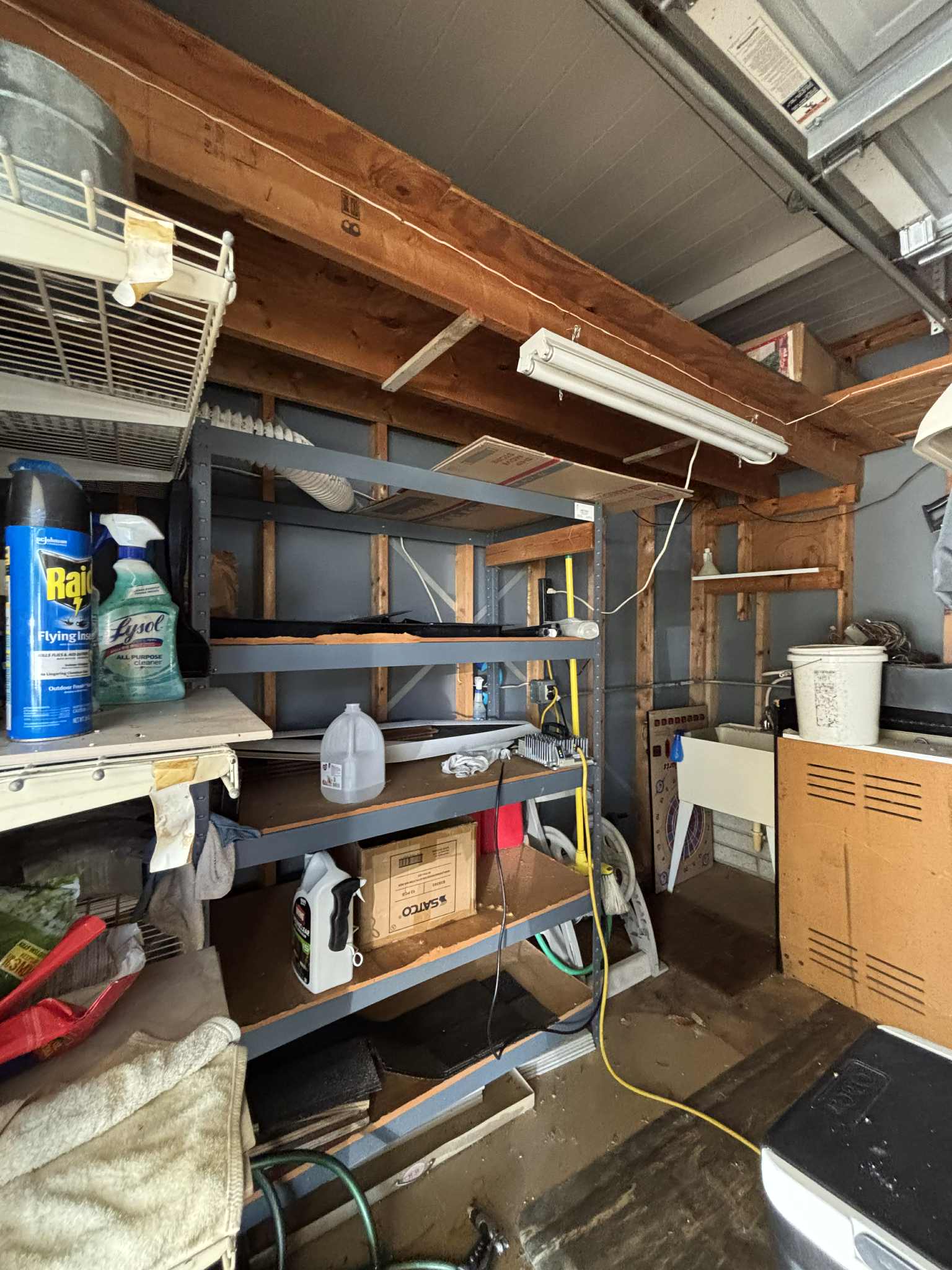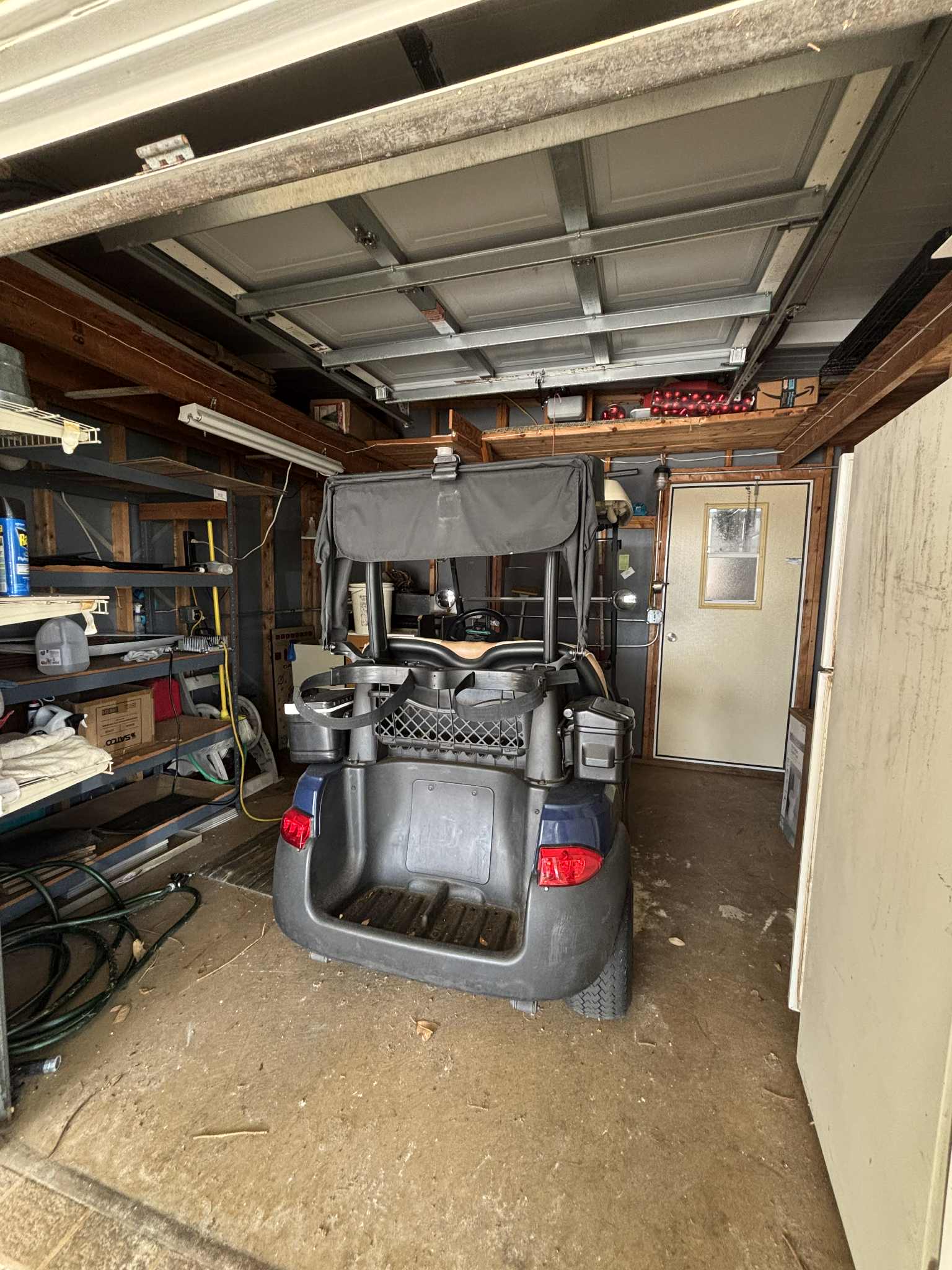 Golf cart garage with heavy-duty shelving, work table, and sink